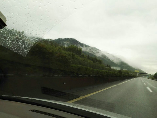 車在暴雨中飛馳,都市的鋼鐵叢林,漸漸在身后遠(yuǎn)去。我們行駛在高速路上,路過高樓林立的郊區(qū),穿越平房聚集的鄉(xiāng)鎮(zhèn),映入眼簾的是連綿不絕的一座座大山,看那雨后的山巒,云在繚繞、霧似升騰,宛如置身仙境。