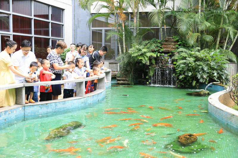 黃的、白的、黑的魚兒在水里游來游去,時(shí)不時(shí)悄悄冒出水面吐一個(gè)夢(mèng)幻般的空氣泡…..在參觀公司時(shí),小朋友們來到了魚池邊,看到魚兒可興奮極了,并在爸爸媽媽的指導(dǎo)下給魚兒投食。