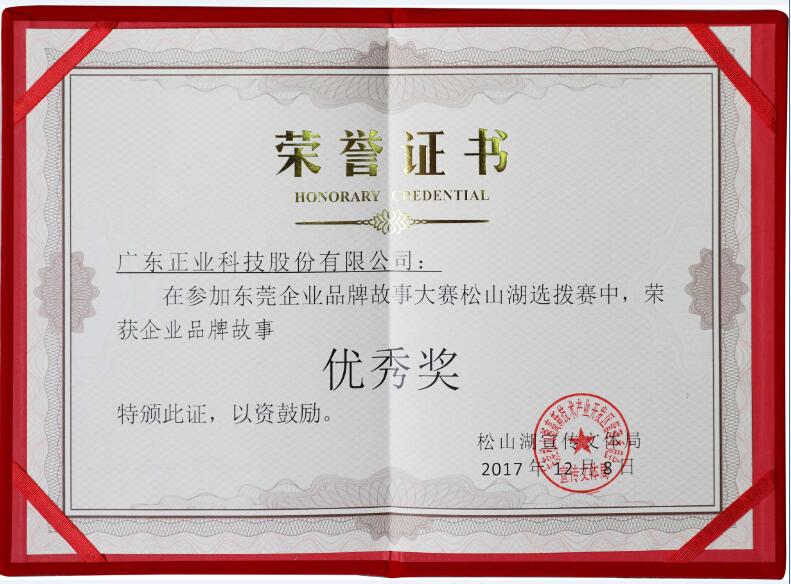 正業(yè)科技市場中心撰寫的《風(fēng)雨同舟攜手廿載,匠心智造鑄就未來》,以正業(yè)科技20年歷程為藍本,講述正業(yè)科技自主創(chuàng)新走民族品牌之路的故事,榮獲“東莞企業(yè)品牌故事大賽”松山湖選拔賽優(yōu)秀獎。