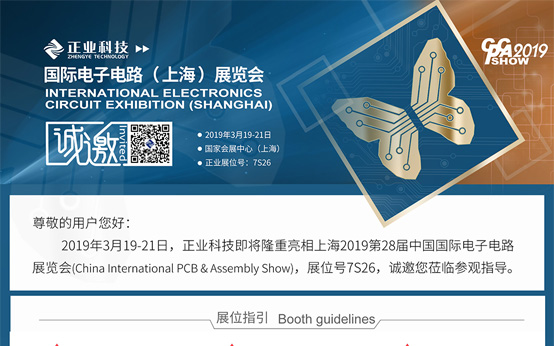 2019年3月19-21日,正業(yè)科技即將隆重亮相上海2019第28屆中國(guó)國(guó)際電子電路展覽會(huì)(China International PCB & Assembly Show),展位號(hào)7S26,誠(chéng)邀您蒞臨參觀指導(dǎo)。