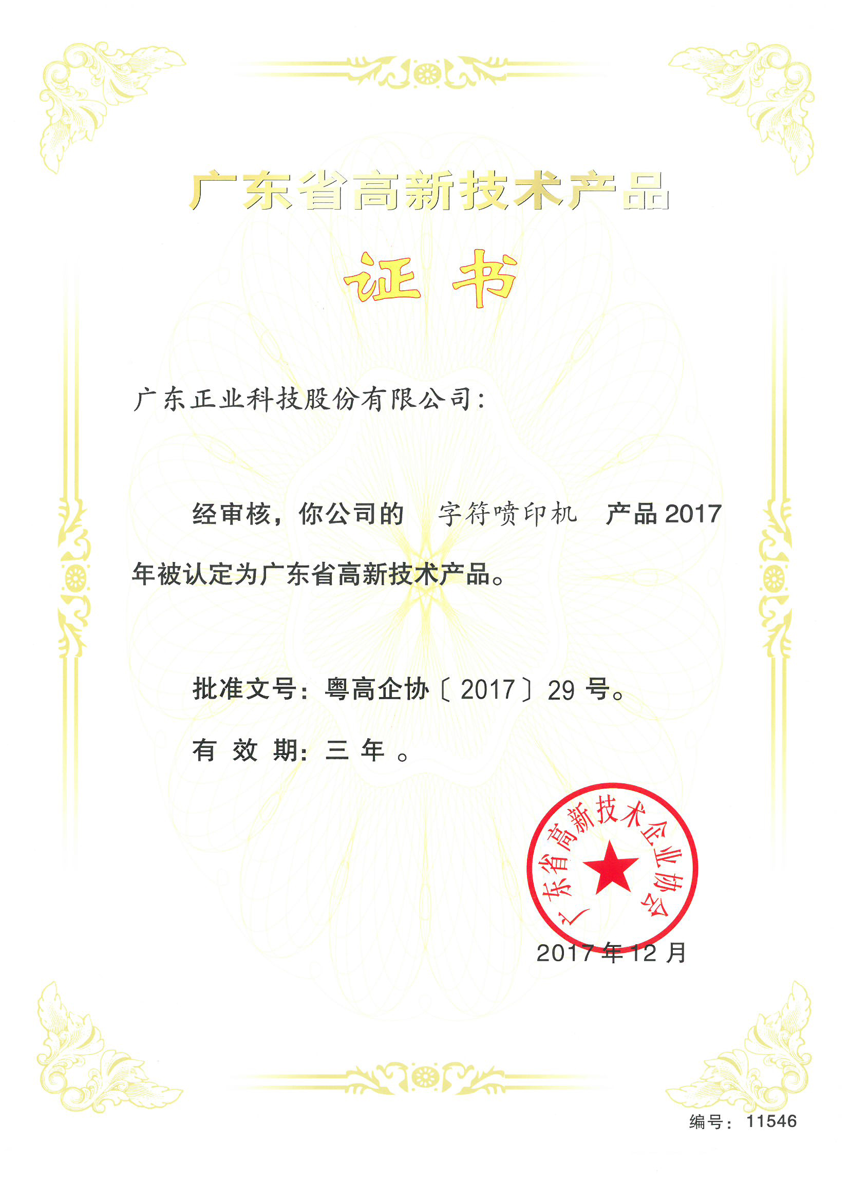 正業(yè)科技字符噴印機(jī)榮獲廣東省高新技術(shù)產(chǎn)品認(rèn)證